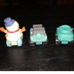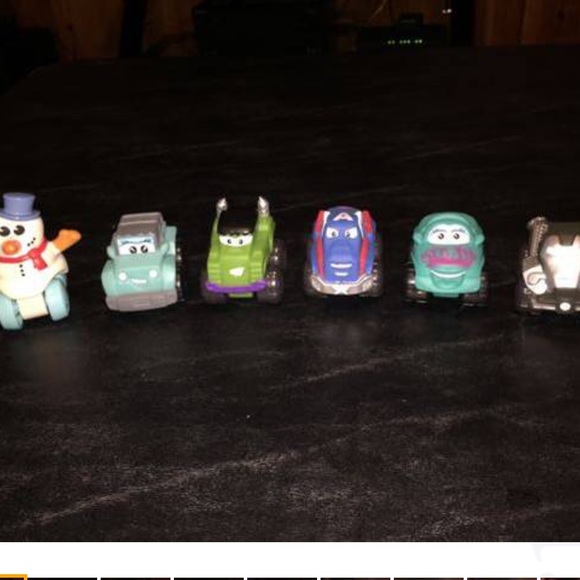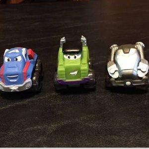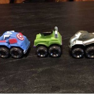 (2.5”). Hasbro - Softer Plastic Racers all roll smooth/fast. Avengers Captain America, War Machine, Frankenstein, Snowman, 2 turquoise “cars” girls. Silver car is tilted but still rolls great (see close-ups). All 6 vehicles -No separating.
