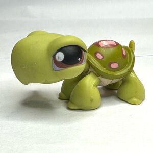Hasbro Littlest Pet Shop (LPS) RETIRED Turtle #007, Bobble Head. Olive green with brown eyes. Shell is dark green with brown and light pink spots. Underbelly is a light cream color. Features a pink magnet in front left foot.