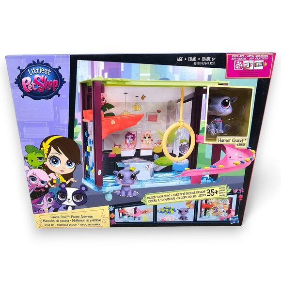 New in box Hasbro Littlest Pet Shop Pawza Pool Style Set. Create! Deco! Style! Collect! Set comes with LPS figure #3835 Harriet Grand Hippo. Box marked 2014. Packaging is in nice shape, shows light signs of age/storage. There is a random sticker on top of box.