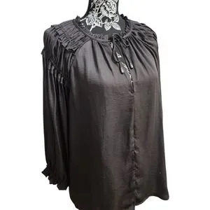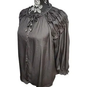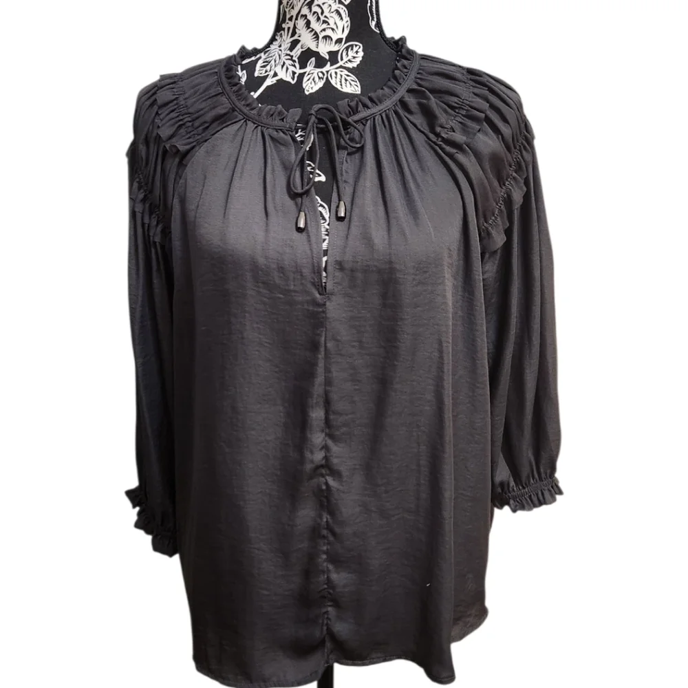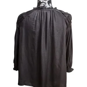 Oversized half sleeve, v-neck top with tie closure accent. Ruffles along shoulders and cuffs.