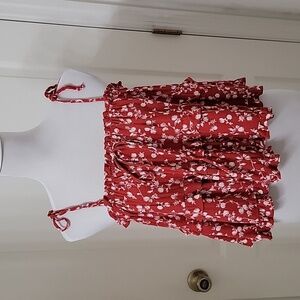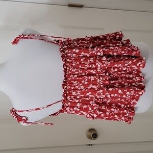 Hashttag Size S Brick Red and White Floral Tiered Halter Top, Tie Shoulders, EUC