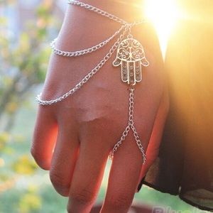 It is a bracelet ring, with a hasma jewel right in the center held with a hand harness. It is gorgeous, and can truly be worn with anything. Great for summer. My hand is a little small for it and it dangles, otherwise I'd wear it all the time.