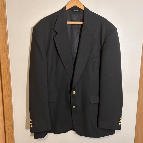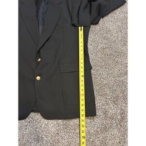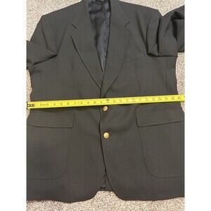 The Hastings & Smith Men's Size 46 L Black Blazer Jacket with Gold Buttons is a stylish and sophisticated addition to any man's wardrobe. Made from wool, this long blazer features a flat front design with a two-button closure and single vented back. Ideal for all seasons, this blazer offers a regular fit for big and tall men, perfect for formal occasions or to elevate a casual look. Made in the United States, this blazer exudes quality and timeless elegance.