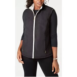 Chic layering piece ensures both style and comfort. This sleek black vest features a quilted design on the sides, offering a touch of texture and visual interest. The full-zip front with a white trim adds a modern, sporty contrast, while the gold-tone hardware provides a subtle touch of elegance. Perfect for adding warmth and style to your outdoor walks or complementing a casual brunch outfit, this vest is a versatile addition to your wardrobe.