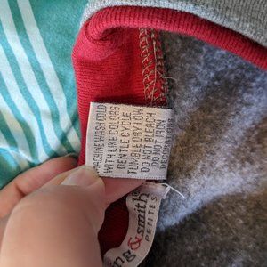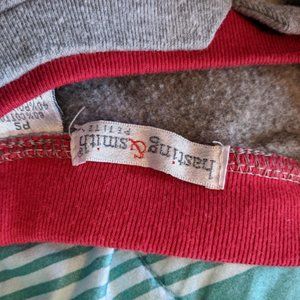 Hasting and Smith gray sweatshirt. The front of the sweatshirt has poinsettias on the left shoulder and bottom right embroidered on it. There are some green leaves and white and gold swirl details around the flowers. It has a crew neckline with a red layer that shows from under the grey neckline. Size small petite