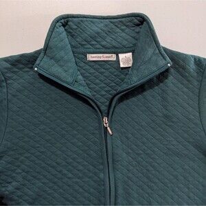 Teal green lightweight (non lined) jacket from Hastings and Smith in women's size small. Zip up with side pockets that also zip. No hood. Allover texteured quilted style fabric, slightly heavier than a long sleeve shirt. Good preowned conditon.