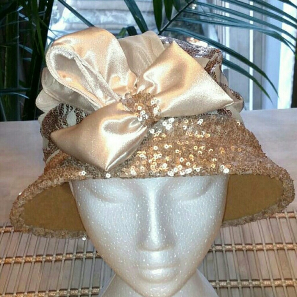 Clouche hat in taupe and rose gold with satin ribbon and sequins over netting