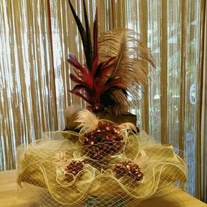 Chiffon hat in burnt gold with feathers and embellishments and velvet ribbon