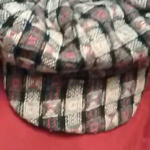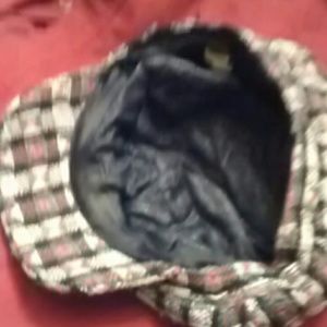 Retro 70's hat button on top. Brim is 2 x 7 in. Quilting lined. Lt pink, dark pink, grey and white woven design. In great condition!