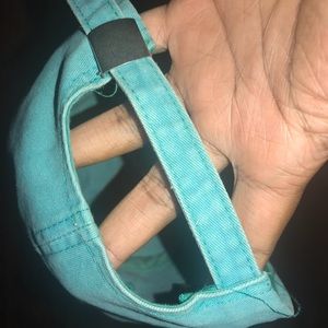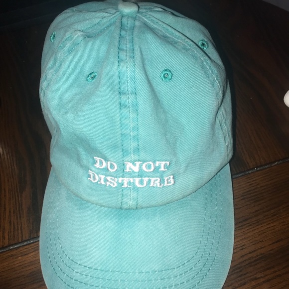 Turquoise hat embroidered with white “Do not disturb”
