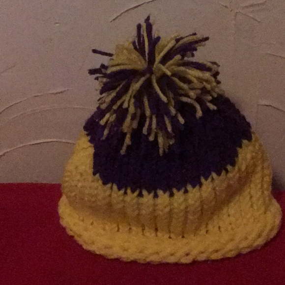 Hand knitted yellow on the bottom with purple on the top. Price $20.00
