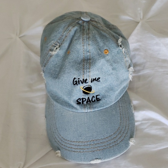 Baseball style light jean hat with saying "give me space" on the front of it with style of scuff mark's.