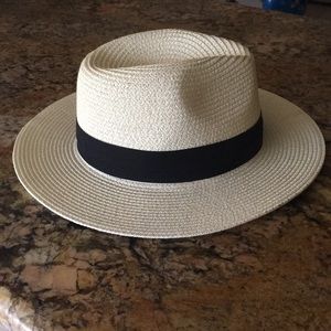 SOLD Cream straw hat with black band. Two ribbons sewn inside to adjust size.