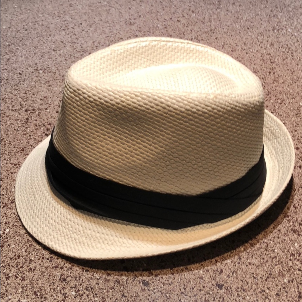 Cream fedora hat with black striped fabric around it