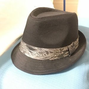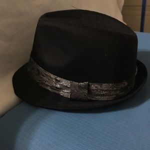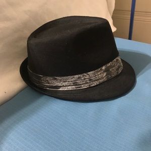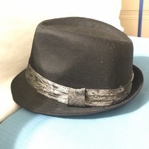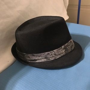 Men’s fedora, black with silver& gray embossed accent at the base. Stylish. Excellent qualify & like new condition.