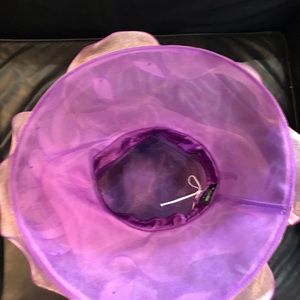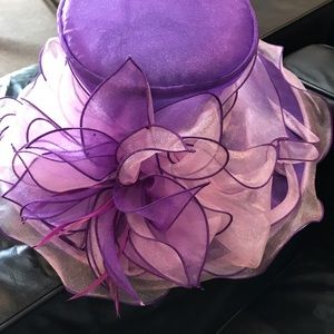 Purple and pink hat with flower and feathers