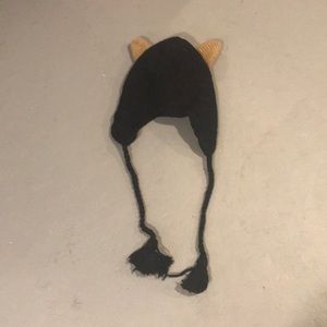 Black winter hat. Youth size Medium. Handmade Bear face on front two strings on each side of hat with Pom Pom ends. It’s adorable