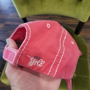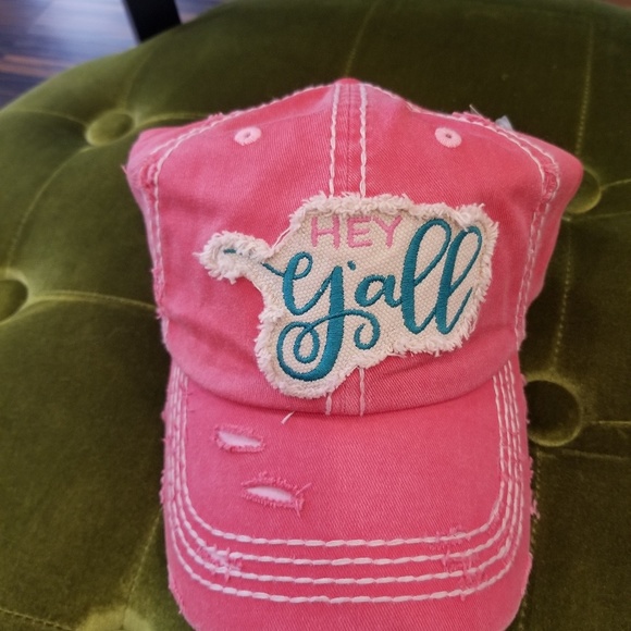 Distressed "Hey ya'll" adjustable hat cross between a pink and a coral color