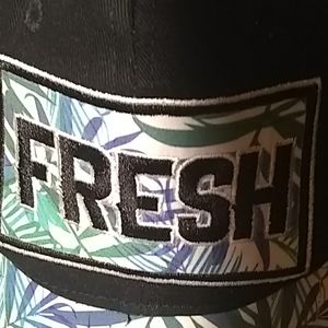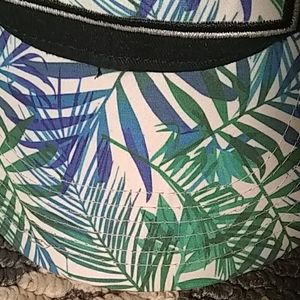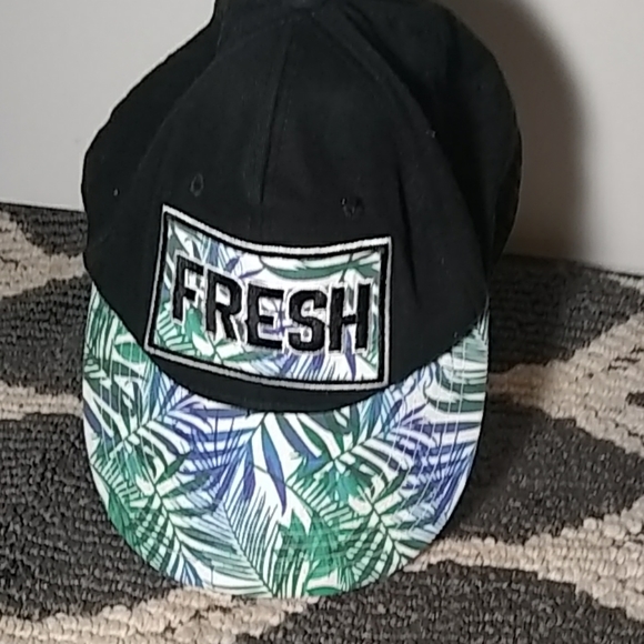 Black baseball cap with blue, green, and black embroidery blue and green leaves on visor part.