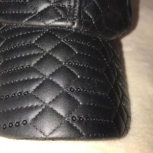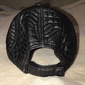 Black tufted material with black sequins. The back has an adjustable Velcro strap.