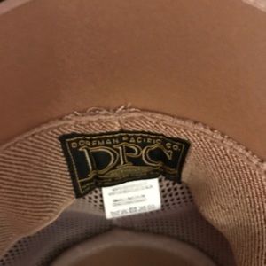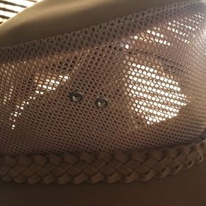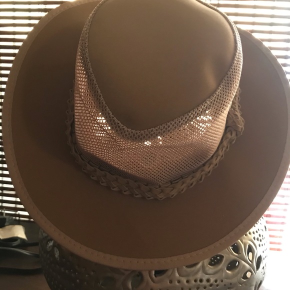 Biege hat with leather trim. Brim and top of hat is a soft suede
