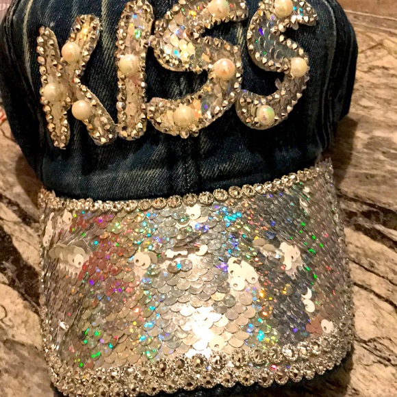 The blue Jean denim hat very gorgeous it has silver shimmer with the word KiSS in shimmer as well as rim atop of hat gorgeous cotton