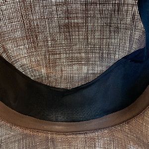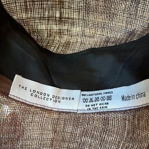 Beautiful hat with florets and delicate feather details. In cream and taupe/mauve color way. Natural fibers.