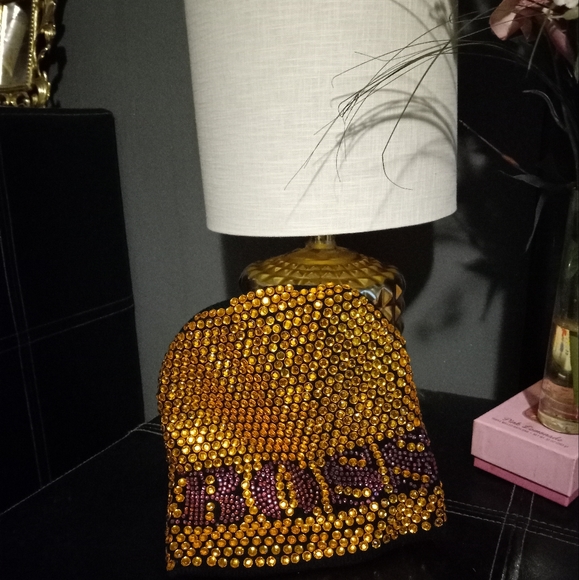 an eye catching hat that says BOSS super cute beaded with gold& pink toned ,solid black on the back stretchy soft quality material