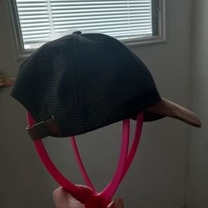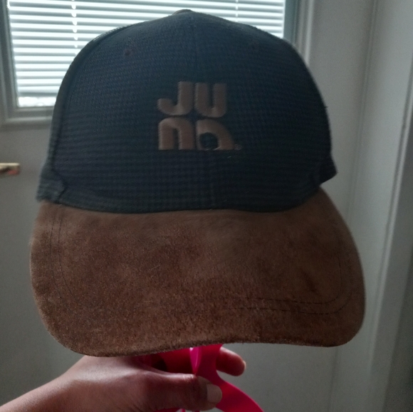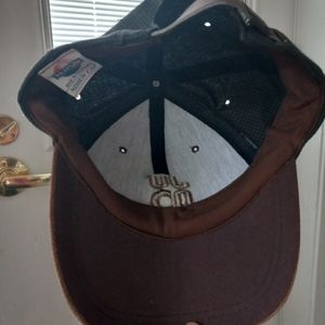 excellent use condition hat adjustable straps one size fits most brown and blue color no holes are stains cute embroidery in the front I believe it says Juno