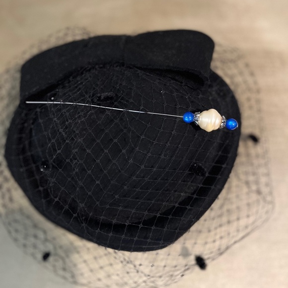 Black wool hat with eye veil and blue hat pi, has attachment combs inside of hat