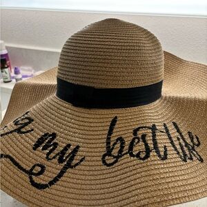 Beautiful straw hat, embroidered with living my best life words on top!