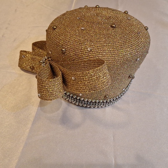 Lawrence Levens gold straw Sunday morning dress hat trimmed in gold beads in great condition. Side gold bow.