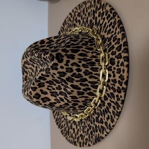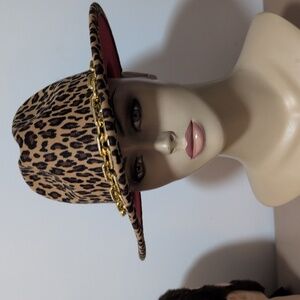 Fashion leopard print hat with plastic chain hat band, solid red lining, adjustable ribbons in the back. One size fits most.