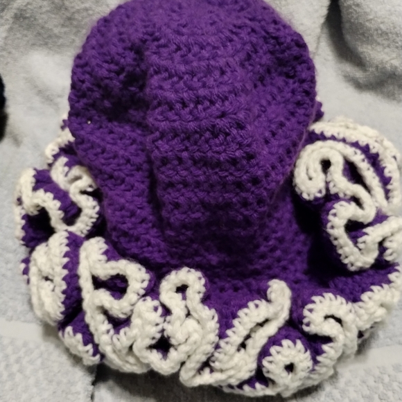 purple ruffle hat with white trim