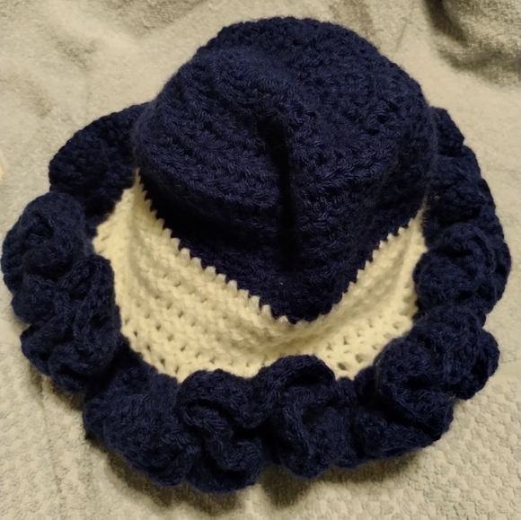 Navy and white ruffle crochet hat