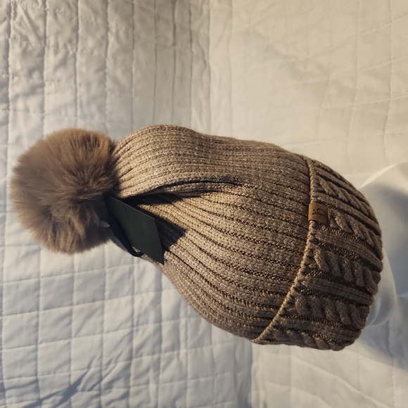 tan with faux fur puff ball