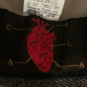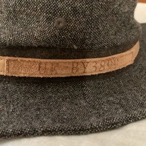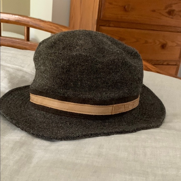 87% Wool and polyester hat with brown and tan suede detail. Size medium.