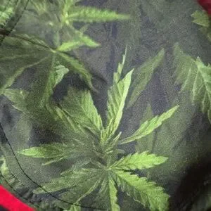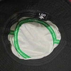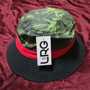 LRG Unisex bucket hat. Black and red rum. Letters in white. Dark and light green leaves. One size fits most.