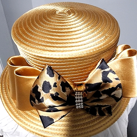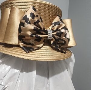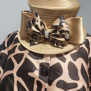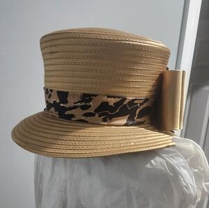 This hat is paired with the EY Boutique 2 piece suit. Sold Separately. It is gold looking with the band and bow matching the 2 piece suit.
