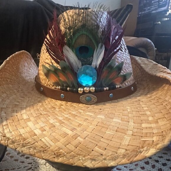 Straw Stetson hat. Medium. Rodeo Dr Collection. Brightened up with some feathers and a little bling