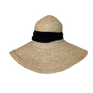 Raffia straw woven sun hat with wide floppy brim. A beautifully crafted piece for beautiful days and sun-hazed afternoons. Cottage core vibes with a cute black hatband with a bow in the back.