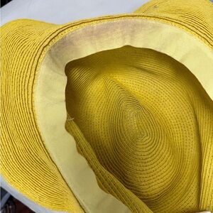 Pretty yellow floppy wide brim sun hat by Hat Attack. Perfect for vacation, poolside, days at the lake, or generally avoiding the suns rays. Interior band does have heavy make up discoloration. Hat has been laundered and is clean! The ribbon does have a bit of discoloration at the knot as well. Not super noticeable. Still a great hat from a quality maker!