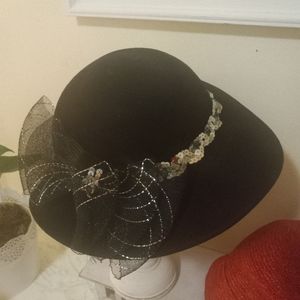 3 gorgeous hats for your festive holidays or whatever mauve mesh hat with shiny silver bow,red vintage type hat and black felt with pretty bow and trim