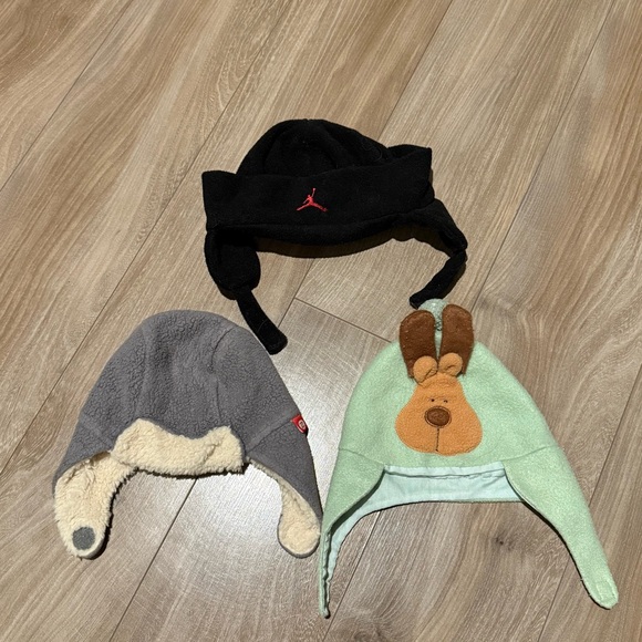 Brands gray Zutano fleece furry trapper 6 month, black Nike toddler hat, not tag on green hat