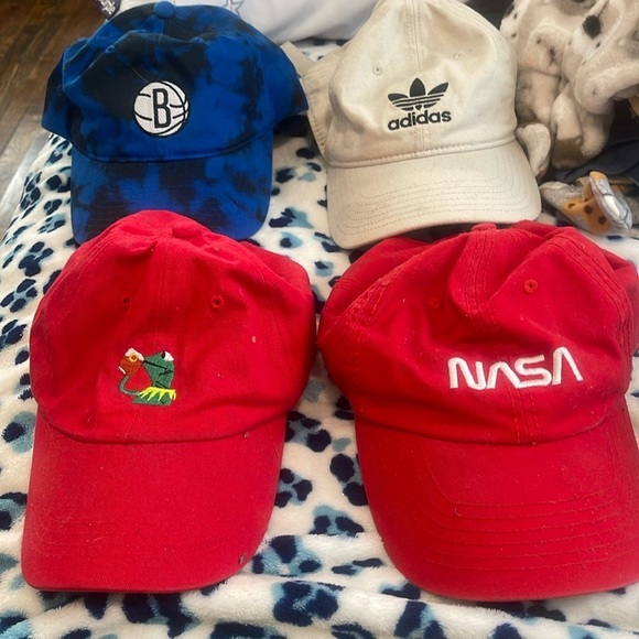 Items are used in a good condition one Kermit, the frog hat, one hot that says NASA one Adidas branded hat that’s like a grayish color could be washed but the hat that’s in perfect condition. Is this blue tie-dyed hat