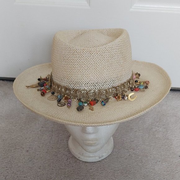 Fun cream colored Hat with a brocade Headband that has lots of beads dangling from the band.The band is removable, it just slips off easy. Inside circumfrence is 21"