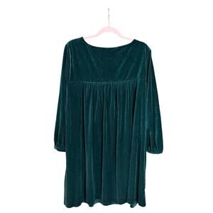 Soft velvet maternity dress in a deep forest green with a relaxed, swingy fit. Long sleeves with gentle gathers at the cuff and a smooth round neckline. The back has a flowy pleated panel for extra comfort and room. Easy throw-on piece that works for holidays, photos, or everyday wear. Pockets included.