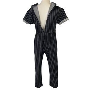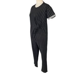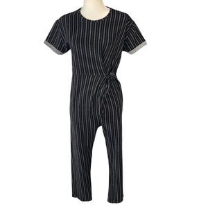 This stylish jumpsuit from Hatch combines comfort and elegance with its cotton, nylon, and silk blend fabric. The black and white striped design adds a classic touch, while the tie-front detail provides a flattering fit. Ideal for both casual and formal settings, it offers a versatile addition to any wardrobe.