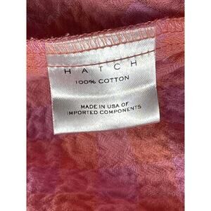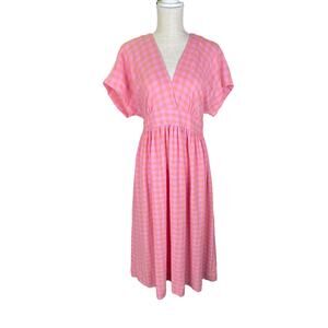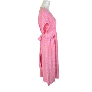 Chic pink midi dress by Hatch. Features a wrap design and short sleeves. Perfect for casual outings.