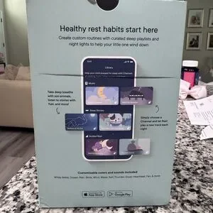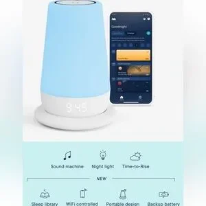 Brand new in box sealed. 90 dollars on amazon. Blue and white night light with sound machine. WiFi controlled. Portable design. Features sleep library and time-to-rise function.